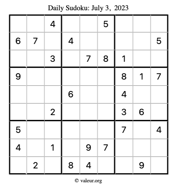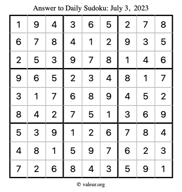 Here is the July 3, 2023 sudoku puzzle. You are welcome to print a copy to solve by hand. For your convenience, we have also included the solution further down the page so you can check your work.