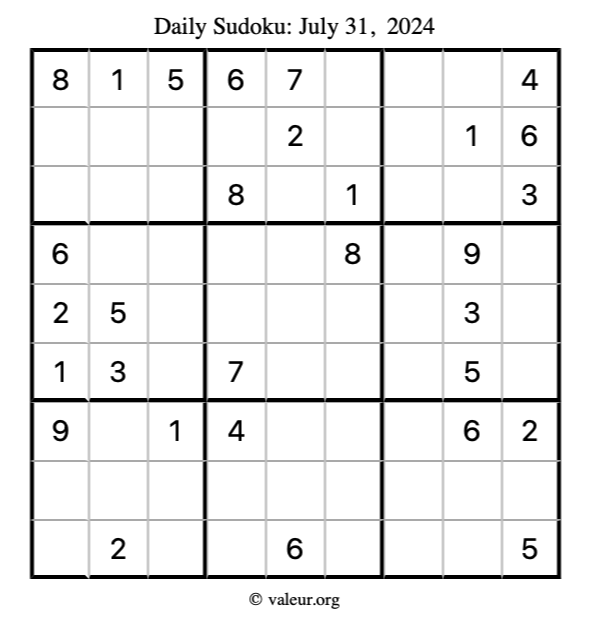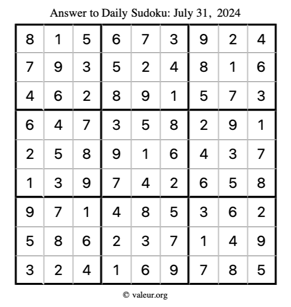 Here is the July 31, 2024 sudoku puzzle. You are welcome to print a copy to solve by hand. For your convenience, we have also included the solution further down the page so you can check your work.
