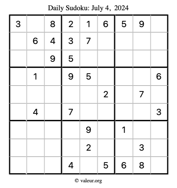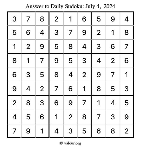 Here is the July 4, 2024 sudoku puzzle. You are welcome to print a copy to solve by hand. For your convenience, we have also included the solution further down the page so you can check your work.