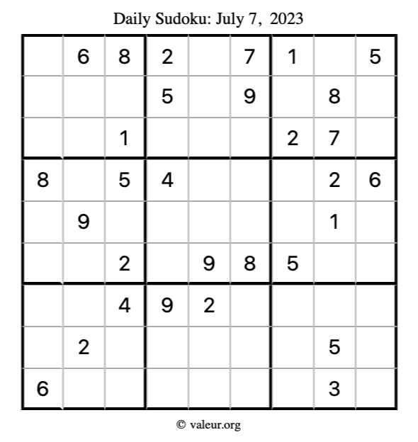 Here is the July 7, 2023 sudoku puzzle. You are welcome to print a copy to solve by hand. For your convenience, we have also included the solution further down the page so you can check your work.