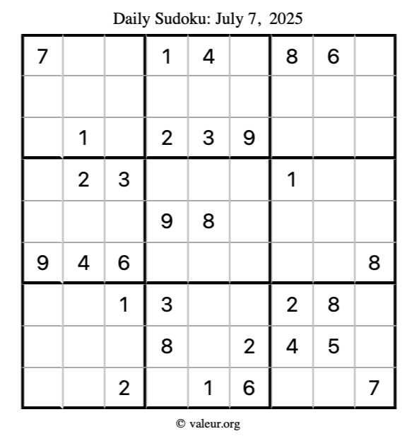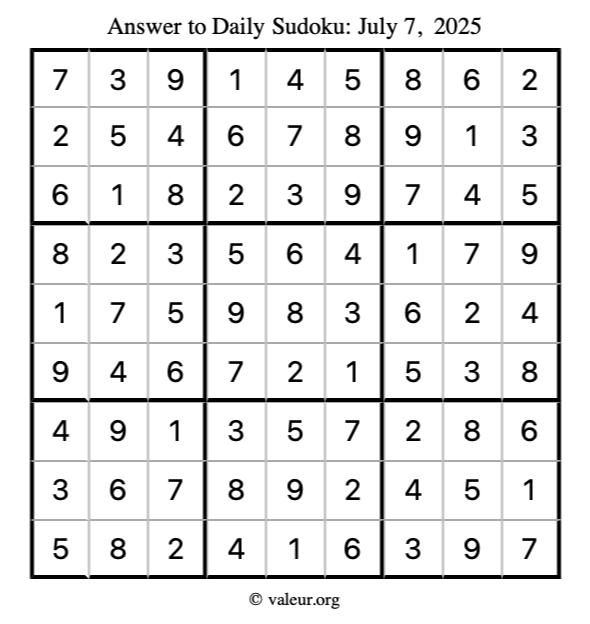 Here is the July 7, 2025 sudoku puzzle. You are welcome to print a copy to solve by hand. For your convenience, we have also included the solution further down the page so you can check your work.