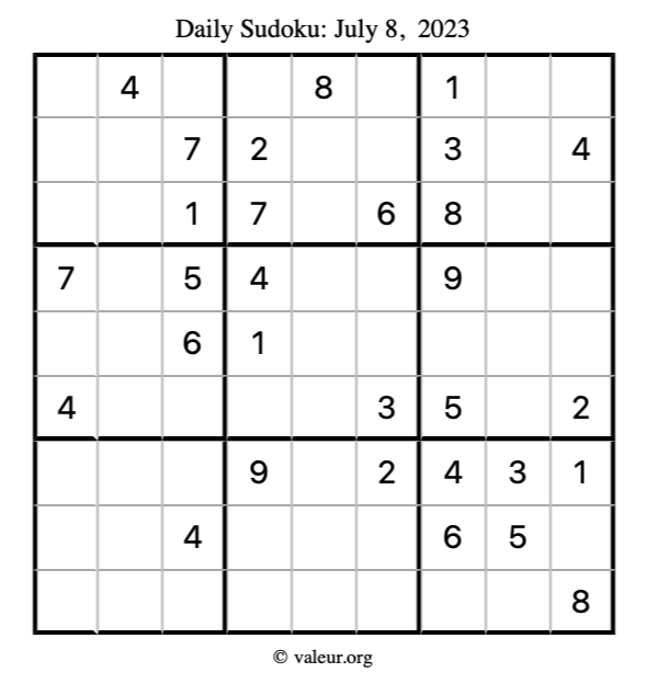 Here is the July 8, 2023 sudoku puzzle. You are welcome to print a copy to solve by hand. For your convenience, we have also included the solution further down the page so you can check your work.