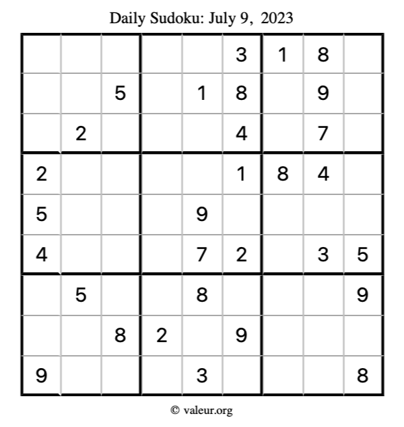 Here is the July 9, 2023 sudoku puzzle. You are welcome to print a copy to solve by hand. For your convenience, we have also included the solution further down the page so you can check your work.