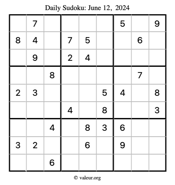 Here is the June 12, 2024 sudoku puzzle. You are welcome to print a copy to solve by hand. For your convenience, we have also included the solution further down the page so you can check your work.