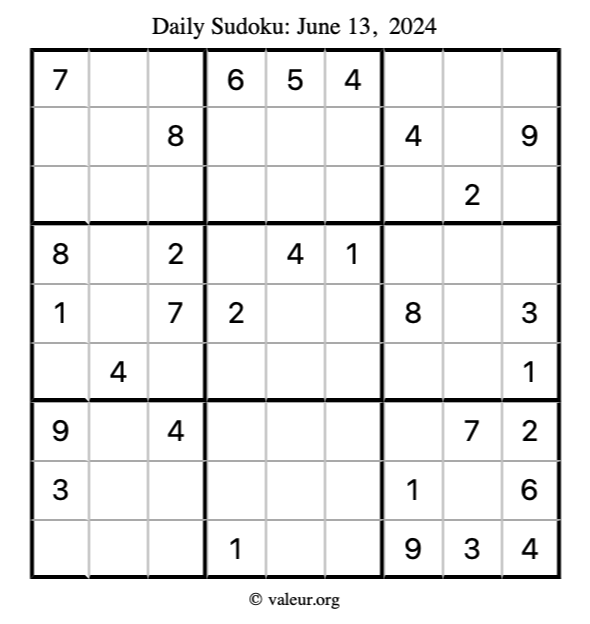 Here is the June 13, 2024 sudoku puzzle. You are welcome to print a copy to solve by hand. For your convenience, we have also included the solution further down the page so you can check your work.