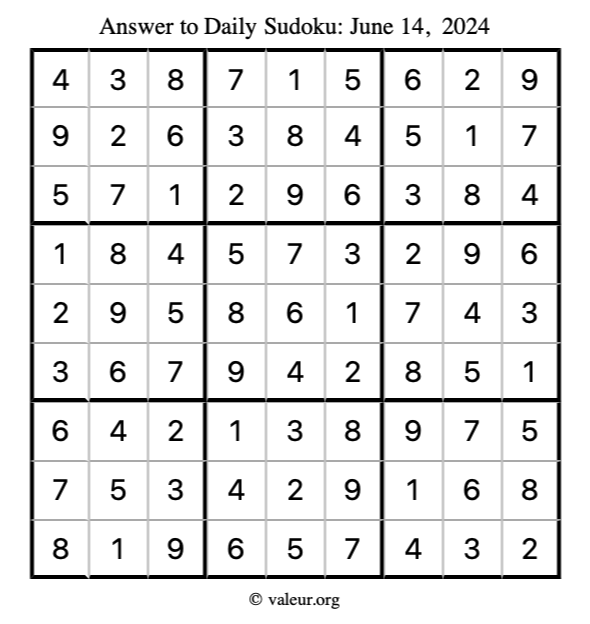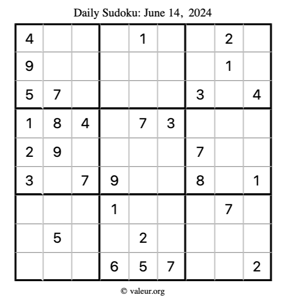 Here is the June 14, 2024 sudoku puzzle. You are welcome to print a copy to solve by hand. For your convenience, we have also included the solution further down the page so you can check your work.