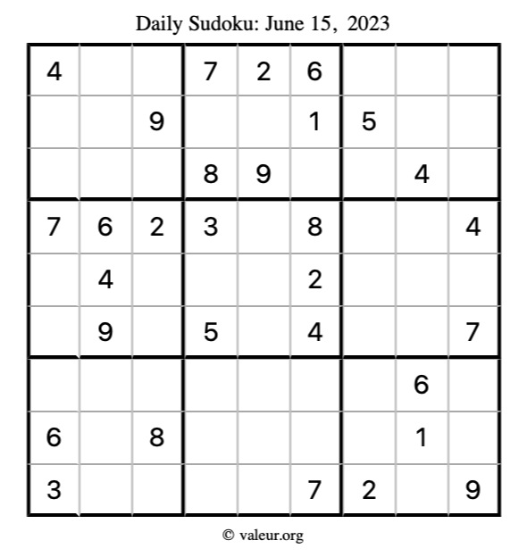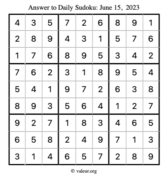 Here is the June 15, 2023 sudoku puzzle. You are welcome to print a copy to solve by hand. For your convenience, we have also included the solution further down the page so you can check your work.