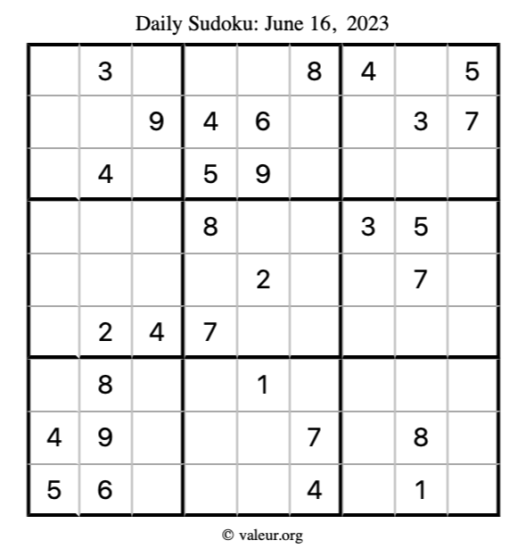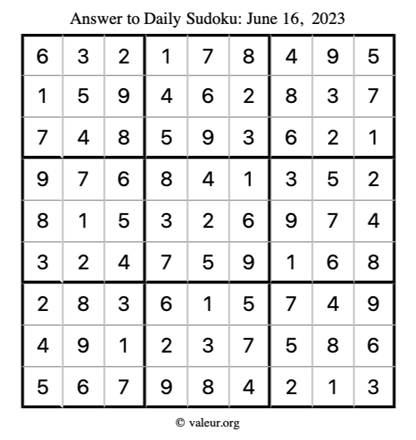 Here is the June 16, 2023 sudoku puzzle. You are welcome to print a copy to solve by hand. For your convenience, we have also included the solution further down the page so you can check your work.