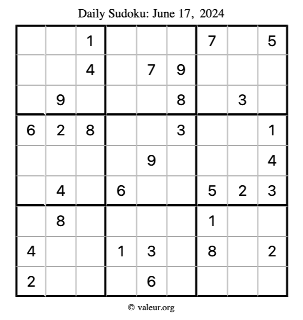 Here is the June 17, 2024 sudoku puzzle. You are welcome to print a copy to solve by hand. For your convenience, we have also included the solution further down the page so you can check your work.