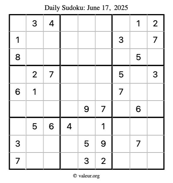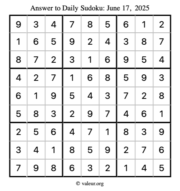 Here is the June 17, 2025 sudoku puzzle. You are welcome to print a copy to solve by hand. For your convenience, we have also included the solution further down the page so you can check your work.