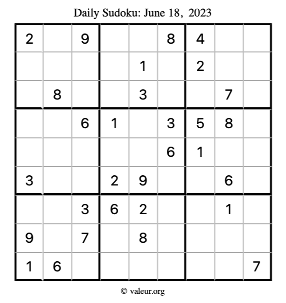Here is the June 18, 2023 sudoku puzzle. You are welcome to print a copy to solve by hand. For your convenience, we have also included the solution further down the page so you can check your work.