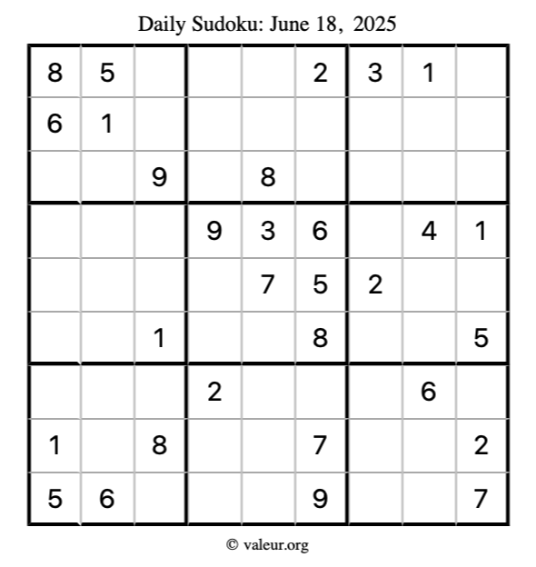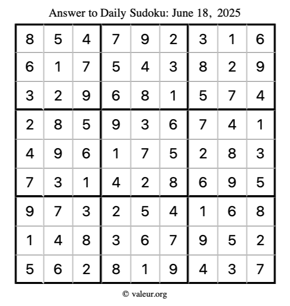 Here is the June 18, 2025 sudoku puzzle. You are welcome to print a copy to solve by hand. For your convenience, we have also included the solution further down the page so you can check your work.