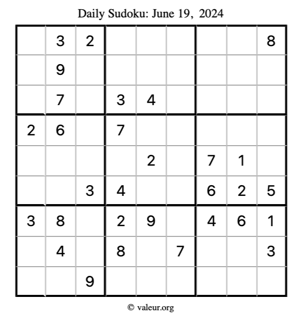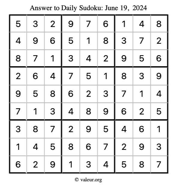 Here is the June 19, 2024 sudoku puzzle. You are welcome to print a copy to solve by hand. For your convenience, we have also included the solution further down the page so you can check your work.