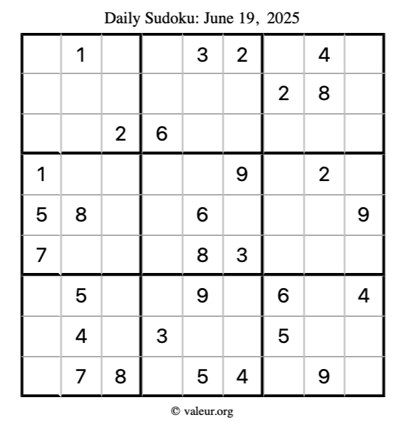 Here is the June 19, 2025 sudoku puzzle. You are welcome to print a copy to solve by hand. For your convenience, we have also included the solution further down the page so you can check your work.