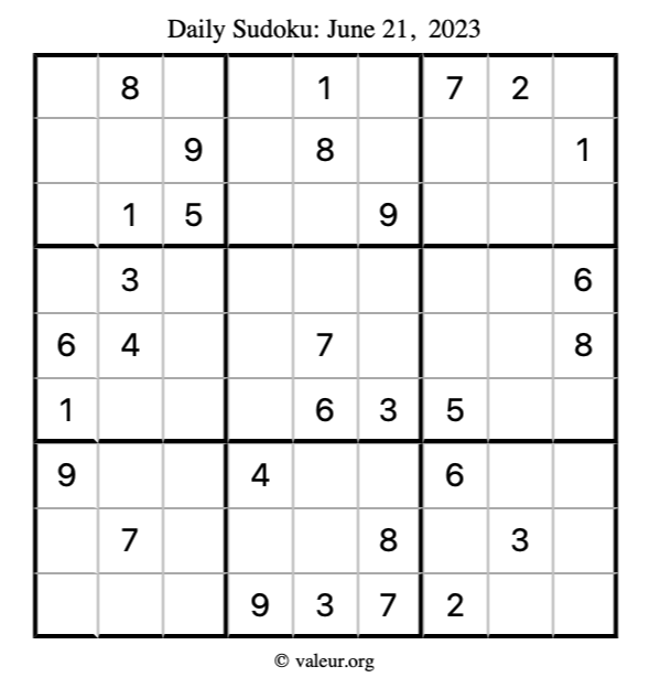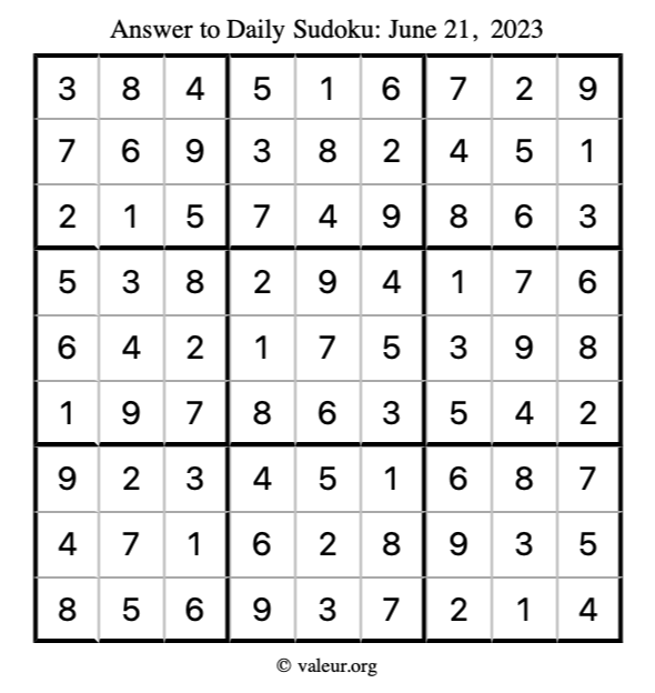 Here is the June 21, 2023 sudoku puzzle. You are welcome to print a copy to solve by hand. For your convenience, we have also included the solution further down the page so you can check your work.
