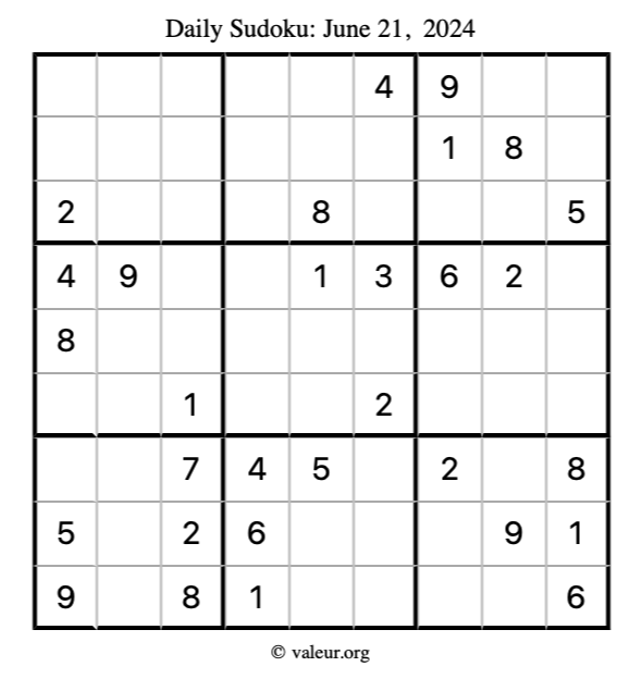 Here is the June 21, 2024 sudoku puzzle. You are welcome to print a copy to solve by hand. For your convenience, we have also included the solution further down the page so you can check your work.