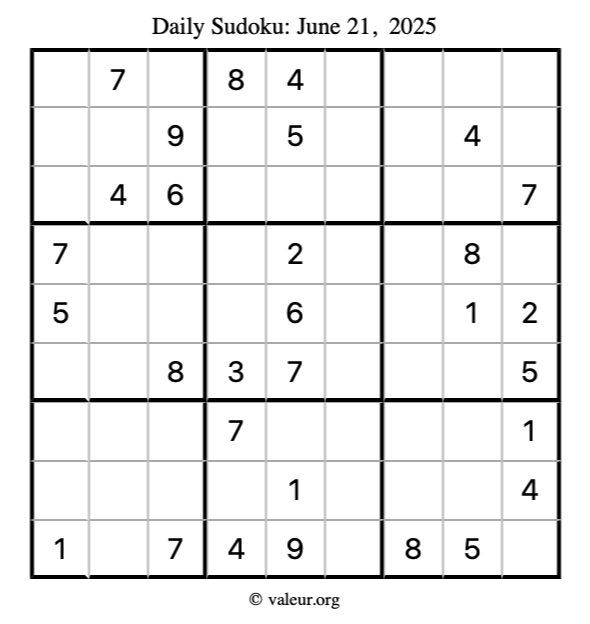 Here is the June 21, 2025 sudoku puzzle. You are welcome to print a copy to solve by hand. For your convenience, we have also included the solution further down the page so you can check your work.