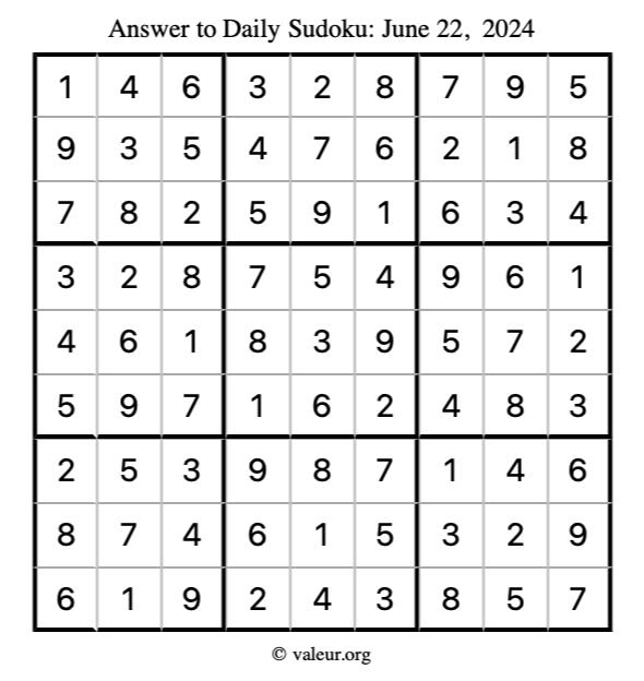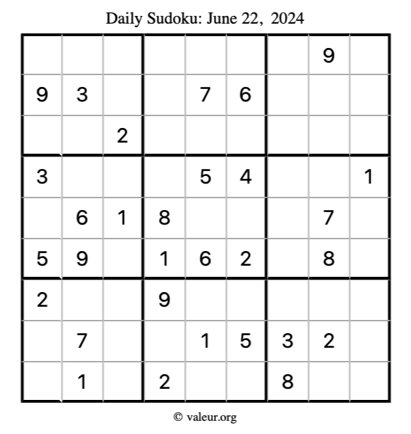 Here is the June 22, 2024 sudoku puzzle. You are welcome to print a copy to solve by hand. For your convenience, we have also included the solution further down the page so you can check your work.