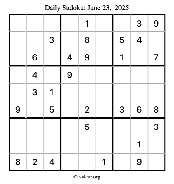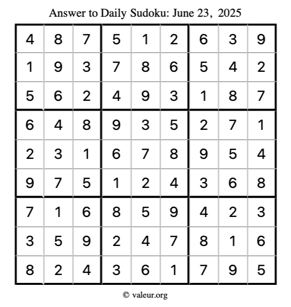 Here is the June 23, 2025 sudoku puzzle. You are welcome to print a copy to solve by hand. For your convenience, we have also included the solution further down the page so you can check your work.