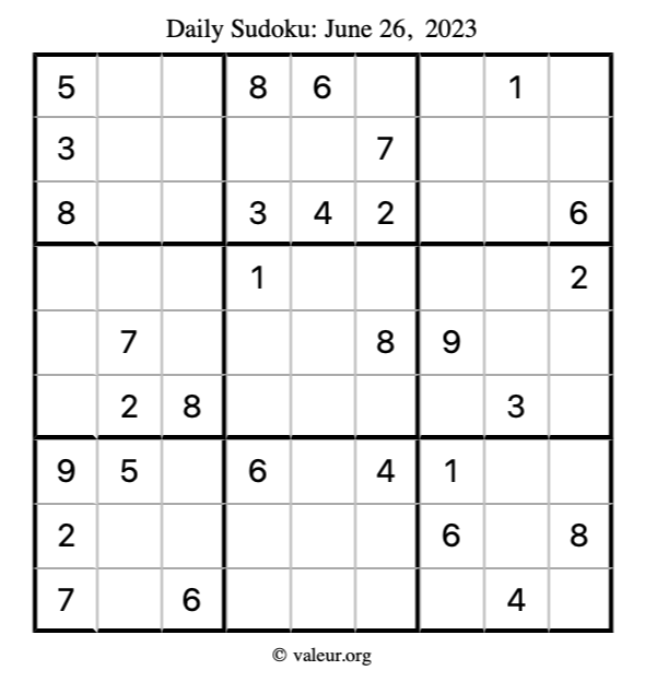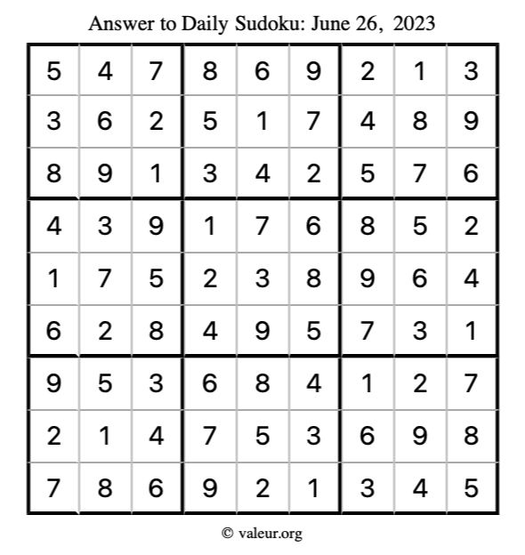 Here is the June 26, 2023 sudoku puzzle. You are welcome to print a copy to solve by hand. For your convenience, we have also included the solution further down the page so you can check your work.