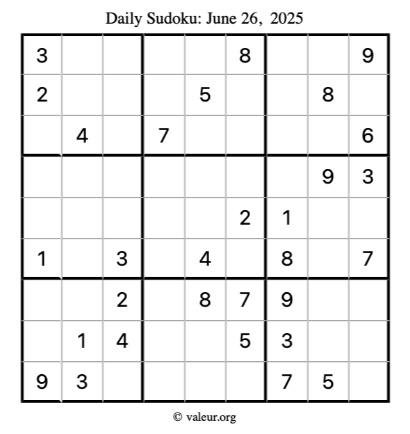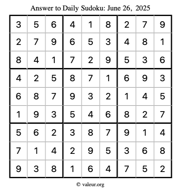 Here is the June 26, 2025 sudoku puzzle. You are welcome to print a copy to solve by hand. For your convenience, we have also included the solution further down the page so you can check your work.