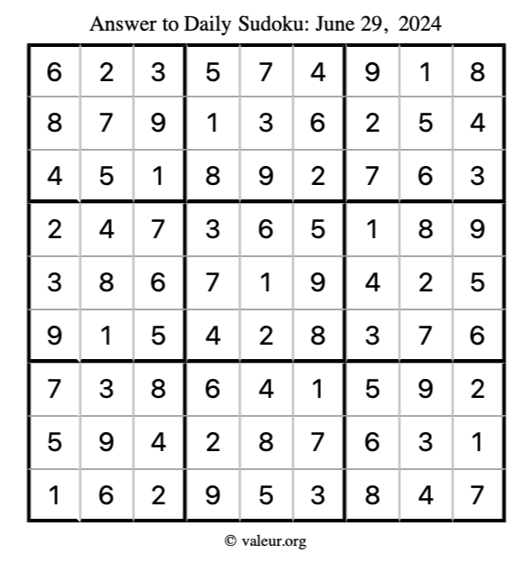 Here is the June 29, 2024 sudoku puzzle. You are welcome to print a copy to solve by hand. For your convenience, we have also included the solution further down the page so you can check your work.