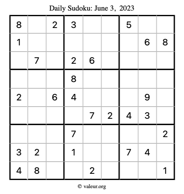 Here is the June 3, 2023 sudoku puzzle. You are welcome to print a copy to solve by hand. For your convenience, we have also included the solution further down the page so you can check your work.