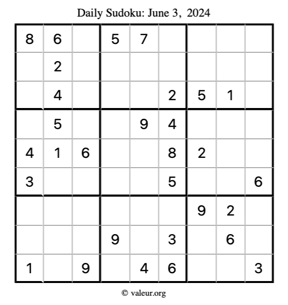 Here is the June 3, 2024 sudoku puzzle. You are welcome to print a copy to solve by hand. For your convenience, we have also included the solution further down the page so you can check your work.