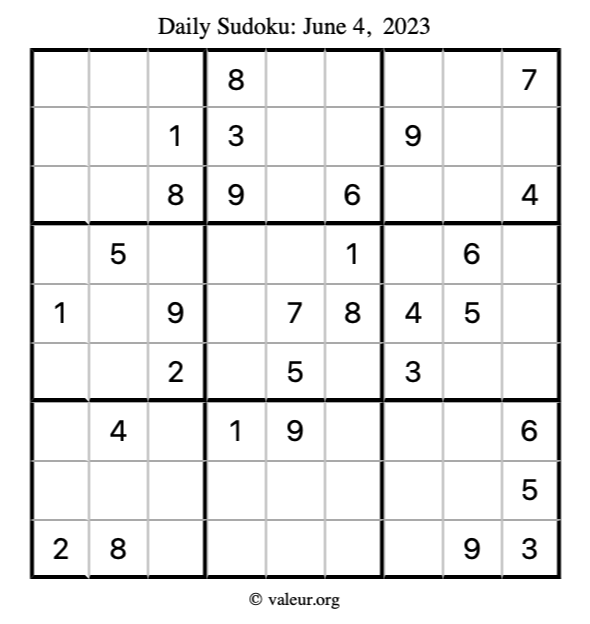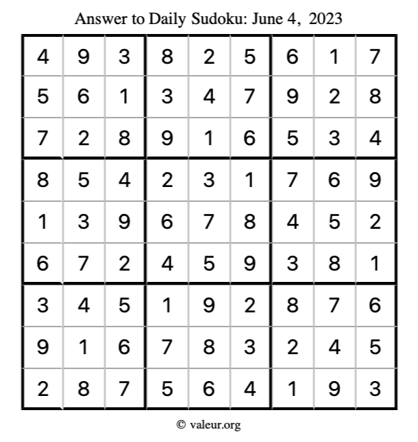 Here is the June 4, 2023 sudoku puzzle. You are welcome to print a copy to solve by hand. For your convenience, we have also included the solution further down the page so you can check your work.