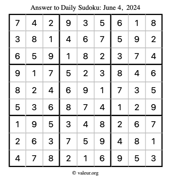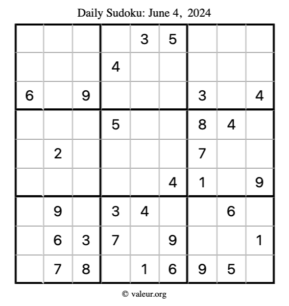 Here is the June 4, 2024 sudoku puzzle. You are welcome to print a copy to solve by hand. For your convenience, we have also included the solution further down the page so you can check your work.