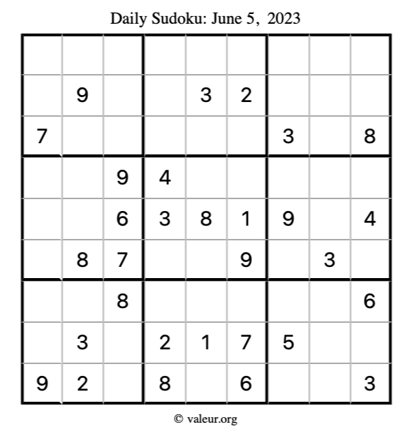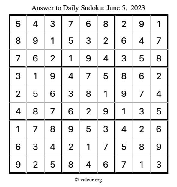 Here is the June 5, 2023 sudoku puzzle. You are welcome to print a copy to solve by hand. For your convenience, we have also included the solution further down the page so you can check your work.