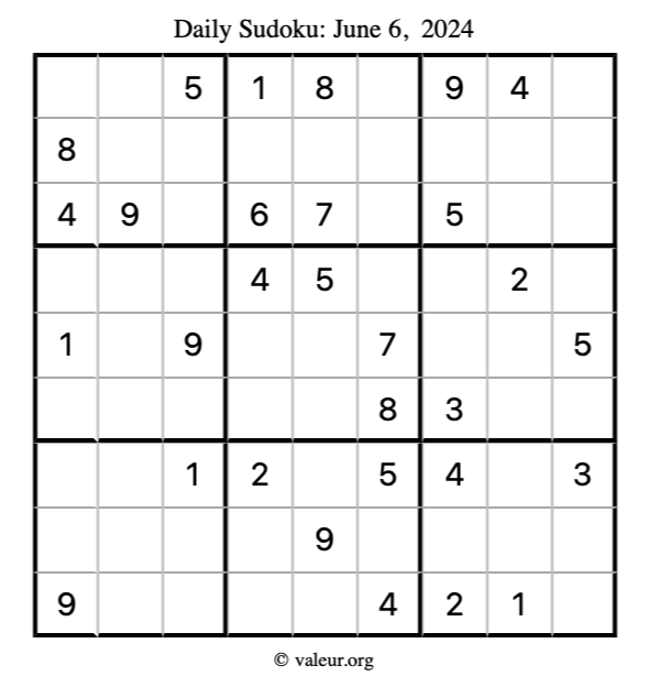 Here is the June 6, 2024 sudoku puzzle. You are welcome to print a copy to solve by hand. For your convenience, we have also included the solution further down the page so you can check your work.