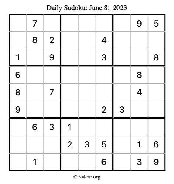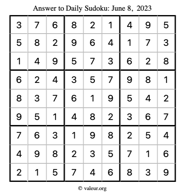 Here is the June 8, 2023 sudoku puzzle. You are welcome to print a copy to solve by hand. For your convenience, we have also included the solution further down the page so you can check your work.