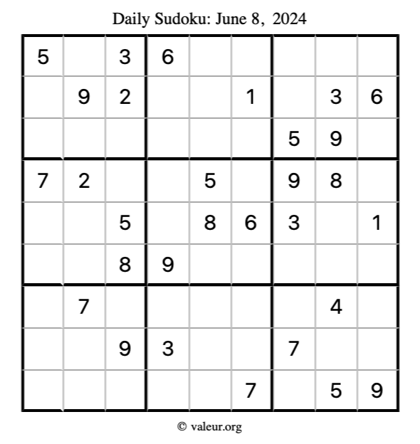 Here is the June 8, 2024 sudoku puzzle. You are welcome to print a copy to solve by hand. For your convenience, we have also included the solution further down the page so you can check your work.