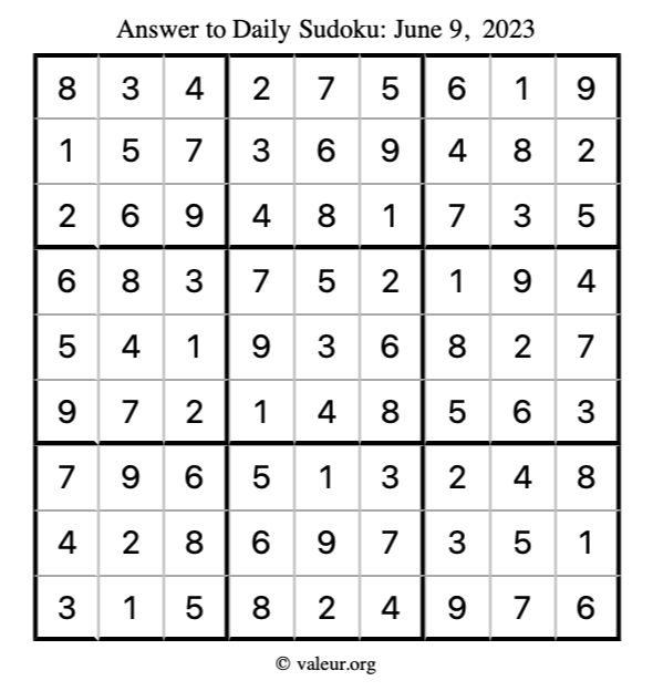Here is the June 9, 2023 sudoku puzzle. You are welcome to print a copy to solve by hand. For your convenience, we have also included the solution further down the page so you can check your work.