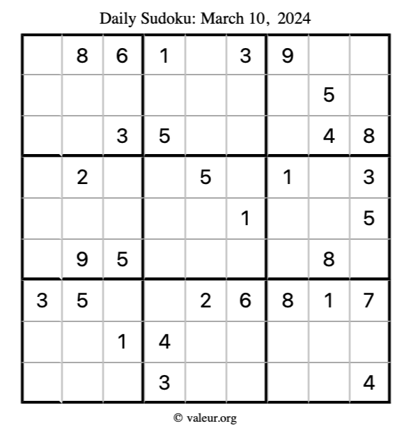 Here is the March 10, 2024 sudoku puzzle. You are welcome to print a copy to solve by hand. For your convenience, we have also included the solution further down the page so you can check your work.