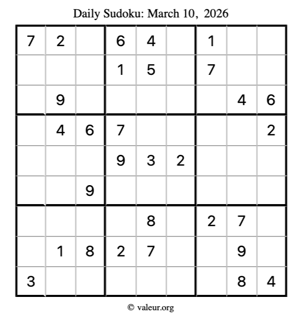 Here is the March 10, 2026 sudoku puzzle. You are welcome to print a copy to solve by hand. For your convenience, we have also included the solution further down the page so you can check your work.