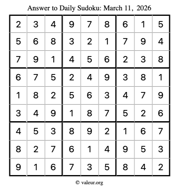 Here is the March 11, 2026 sudoku puzzle. You are welcome to print a copy to solve by hand. For your convenience, we have also included the solution further down the page so you can check your work.