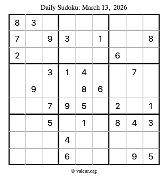Here is the March 13, 2026 sudoku puzzle. You are welcome to print a copy to solve by hand. For your convenience, we have also included the solution further down the page so you can check your work.