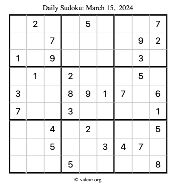 Here is the March 15, 2024 sudoku puzzle. You are welcome to print a copy to solve by hand. For your convenience, we have also included the solution further down the page so you can check your work.