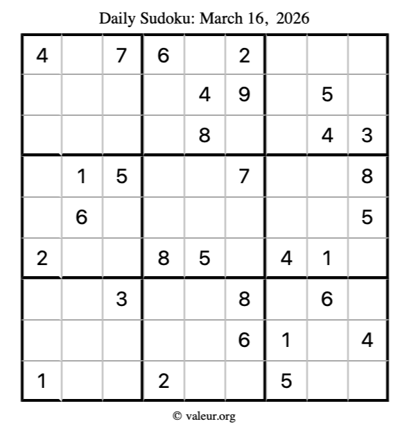 Here is the March 16, 2026 sudoku puzzle. You are welcome to print a copy to solve by hand. For your convenience, we have also included the solution further down the page so you can check your work.