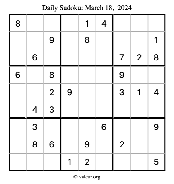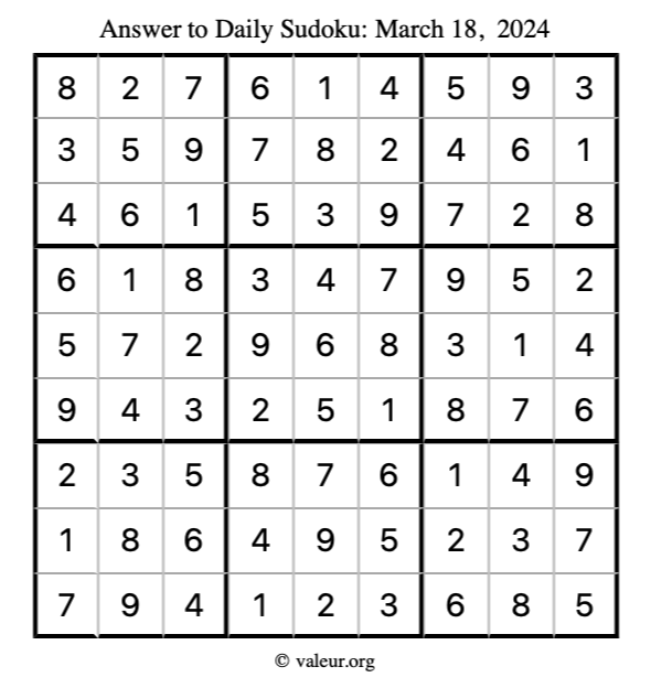 Here is the March 18, 2024 sudoku puzzle. You are welcome to print a copy to solve by hand. For your convenience, we have also included the solution further down the page so you can check your work.