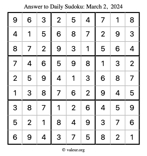 Here is the March 2, 2024 sudoku puzzle. You are welcome to print a copy to solve by hand. For your convenience, we have also included the solution further down the page so you can check your work.