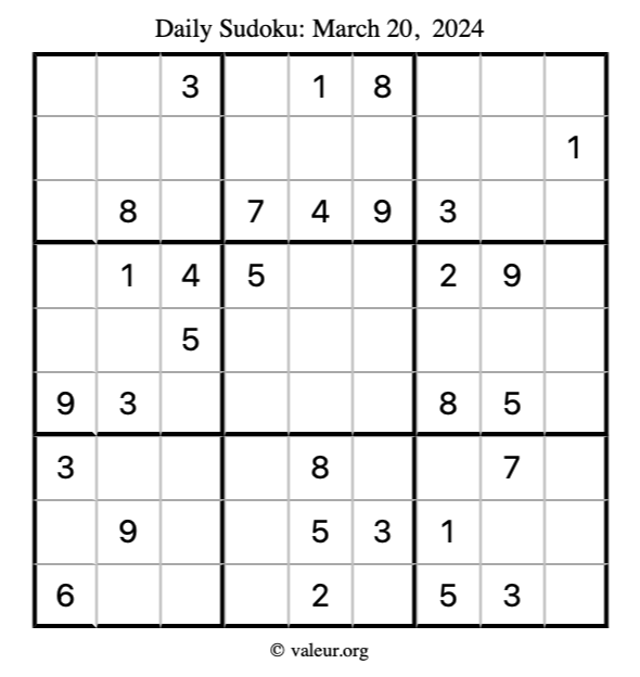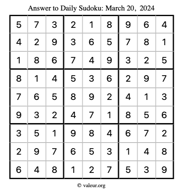 Here is the March 20, 2024 sudoku puzzle. You are welcome to print a copy to solve by hand. For your convenience, we have also included the solution further down the page so you can check your work.