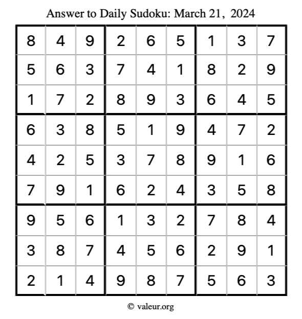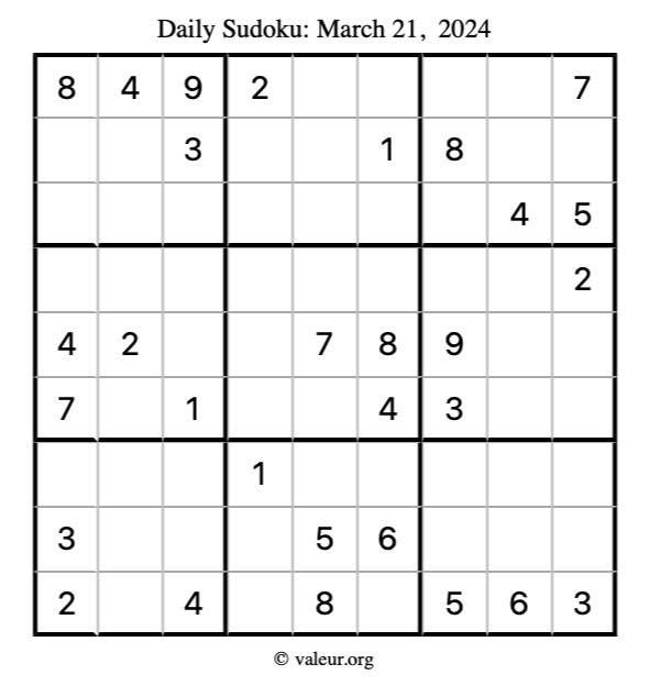 Here is the March 21, 2024 sudoku puzzle. You are welcome to print a copy to solve by hand. For your convenience, we have also included the solution further down the page so you can check your work.