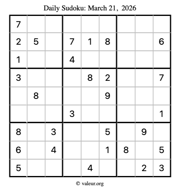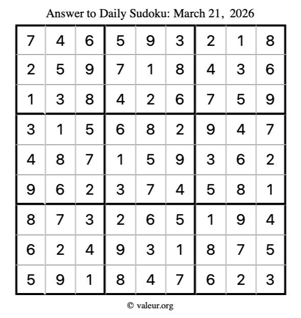 Here is the March 21, 2026 sudoku puzzle. You are welcome to print a copy to solve by hand. For your convenience, we have also included the solution further down the page so you can check your work.
