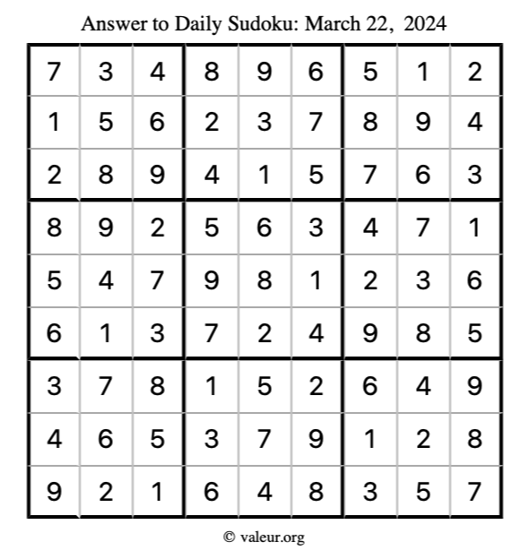 Here is the March 22, 2024 sudoku puzzle. You are welcome to print a copy to solve by hand. For your convenience, we have also included the solution further down the page so you can check your work.