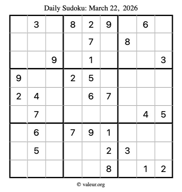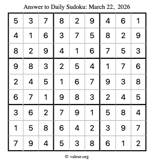 Here is the March 22, 2026 sudoku puzzle. You are welcome to print a copy to solve by hand. For your convenience, we have also included the solution further down the page so you can check your work.