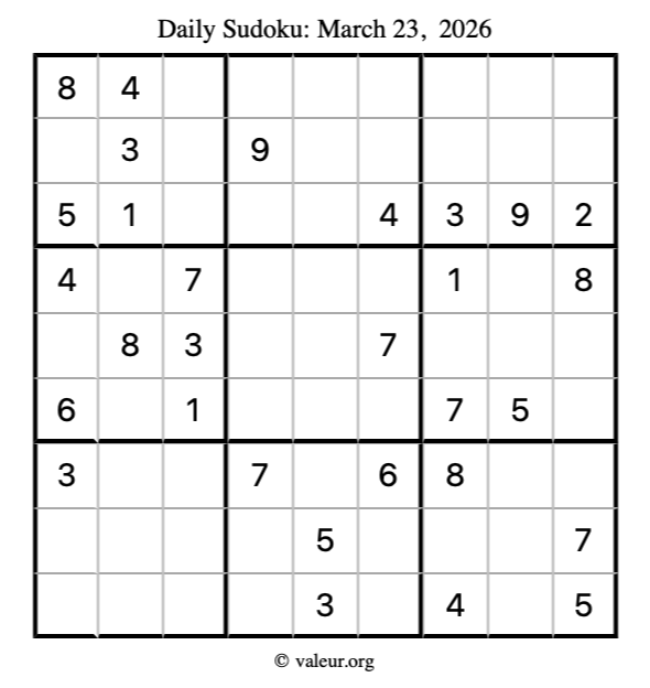 Here is the March 23, 2026 sudoku puzzle. You are welcome to print a copy to solve by hand. For your convenience, we have also included the solution further down the page so you can check your work.