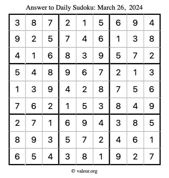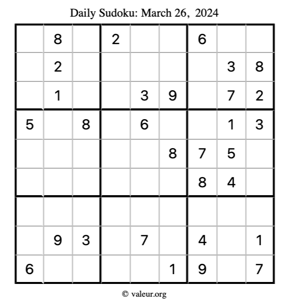 Here is the March 26, 2024 sudoku puzzle. You are welcome to print a copy to solve by hand. For your convenience, we have also included the solution further down the page so you can check your work.